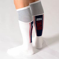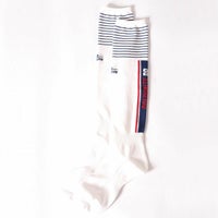 ふくらはぎ部分にロゴや色を配色し印象的なデザインのソックス。