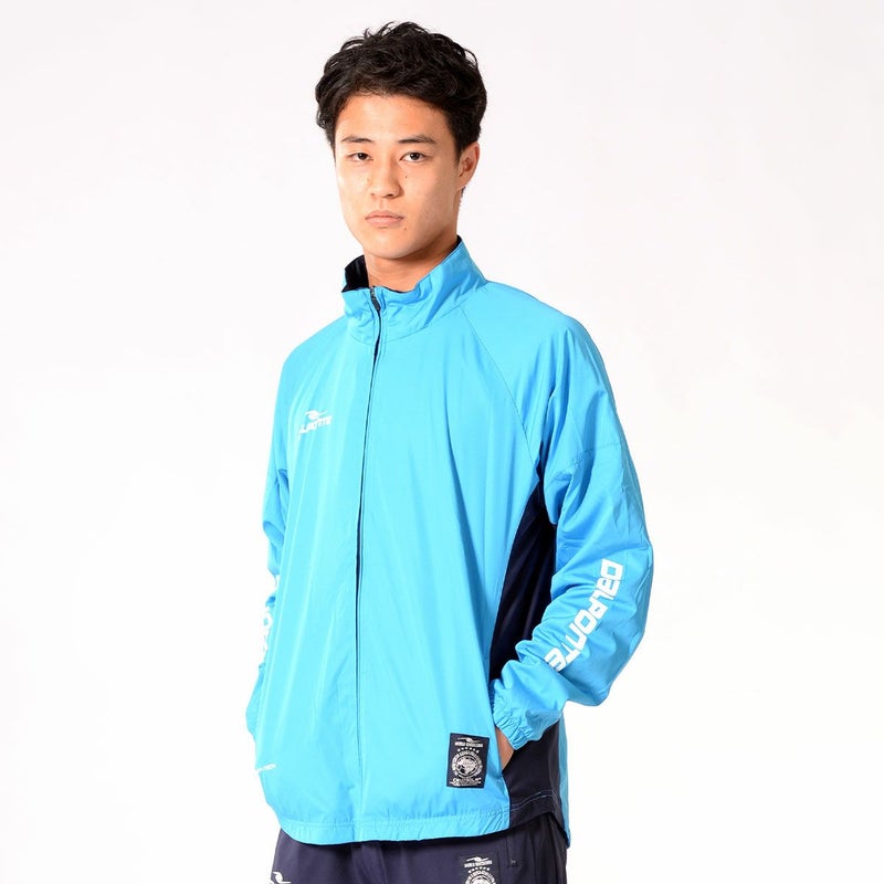 メインの布帛×脇のストレッチ素材のウィンドブレーカー。裏地にはメッシュ生地を採用。脇のストレッチ生地が動きのストレスを軽減。 チーム対応継続商品。